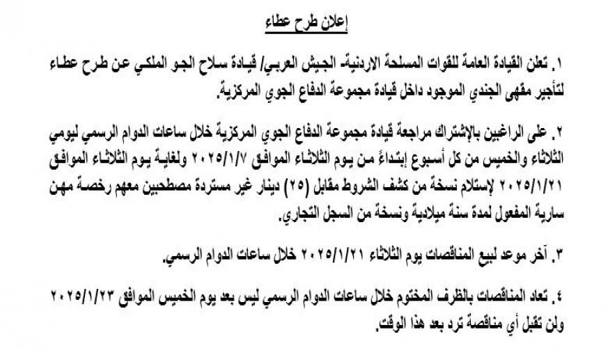 1. تعلن القيادة العامة للقوات المسلحة الاردنية- الجيش العربي/ قيادة سلاح الجو الملكي عن طرح عطاء لتأجير مقهى الجندي الموجود داخل قيادة مجموعة الدفاع الجوي المركزية.