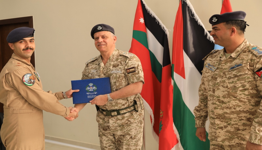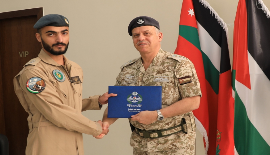 رعى سمو الأمير فيصل بن الحسين في قيادة سلاح الجو الملكي، اليوم الخميس، حفل تخريج دورتي الطيران التحويلي 24 و25 للطيران القتالي على طائرة إف - 16.